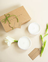 Set of two soy wax urlis. The ceramic candles are packed in our classic brown box, finished with a thread and tag.